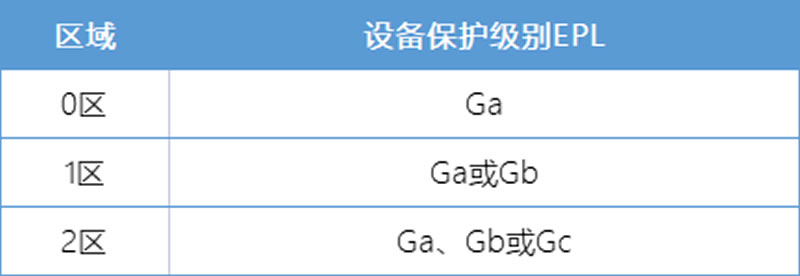 根据危险场所分类,防爆区域与适用的设备保护级别EPL关系如下: