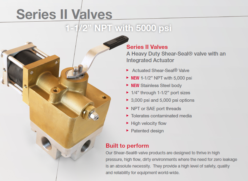 Barksdale's patented Series II valve provides an optimal solution by combining the dependable features of our heavy duty Shear-Seal valves with the reliability of a rack and pinion pilot actuator, all in one integrated package. With the ability to handle high velocity flows at pressures up to 6000 psi and tolerate contaminated media, the Series II valve becomes the choice for the toughest applications.